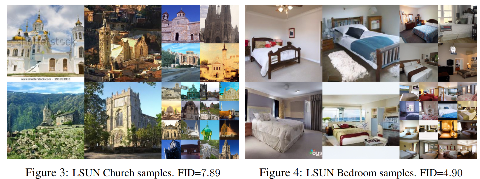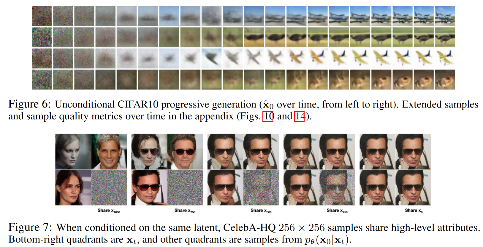 또한 CIFAR-10 데이터셋에 대해 Inception Score, FID Score, 그리고 음의 로그 가능도(즉, 손실 없는 부호화 길이)를 비교하였다. 실험 결과, 제안된 비조건부(unconditional) 모델은 FID 점수 3.17을 기록하여, 기존 문헌에 보고된 대부분의 모델(심지어 클래스 조건부 모델까지 포함하여)보다 더 높은 샘플 품질을 달성하였다. 이 FID는 관례에 따라 학습 집합에 대해 계산된 값이다. 테스트 집합에 대해 계산했을 때는 5.24를 기록했으며, 이 값 역시 문헌에서 보고된 많은 학습 집합 기준 FID 점수보다 우수하다. 또한, 변분경계(true variational bound)에 기초해 모델을 학습했을 때는 더 나은 부호화 길이(codelength)를 얻을 수 있었으나, 단순화된 목적식(simplified objective)을 사용했을 때는 샘플 품질이 가장 높아졌다. 저자들은 이러한 결과를 CIFAR-10과 CelebA-HQ $256\times256$ 샘플(Fig. 1), LSUN $256\times256$ 샘플(Fig. 3 및 Fig. 4)에서 시각적으로 제시하였으며, 추가적인 결과는 부록 D에 포함하였다. 정리하면 본 결과는 단순화된 목적식이 부호화 효율에서는 다소 불리할 수 있으나 샘플 품질을 극대화하는 데 유리하다는 점을 실험적으로 보여준다.
