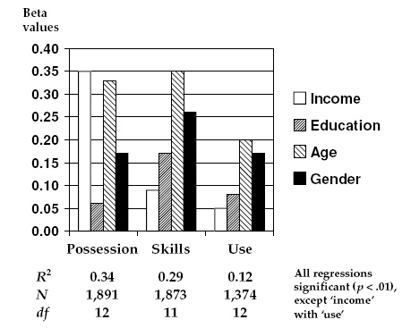 - SCP (1998, 2000): 소득은 장비 소유의 중요한 요인이지만, 기술 숙련도와 사용 방식은 주로 연령과 성별의 영향을 받는다.