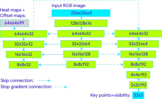 이와 같은 BlazePose 아키텍처의 설계는 주로 모바일 환경에서 실시간으로 신체의 자세를 정확하게 추정하기 위한 목적으로, 모바일 CPU에서도 빠르게 실행되는 경량화된 신경망을 구현하기 위해 설계되었습니다.