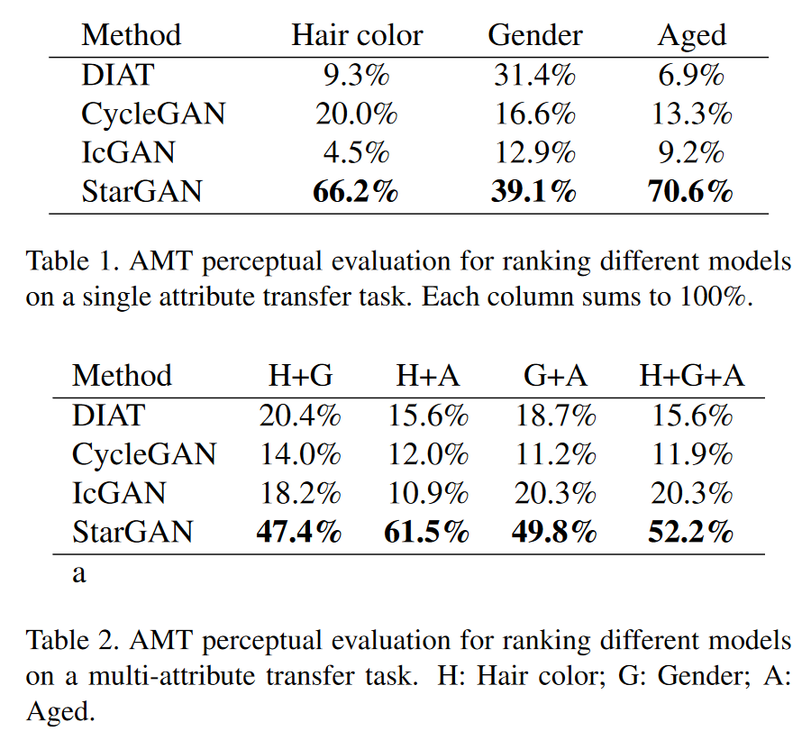 저자들은 단일·다중 속성 전이 과제에서 StarGAN을 기존 베이스라인들과 체계적으로 비교하였다. 먼저 DIAT와 CycleGAN처럼 “두 도메인 전용” 교차 도메인 모델은 가능한 모든 속성 값 쌍에 대해 각각 별도의 모델을 여러 번 학습시켰고, 다중 속성 전이는 머리색을 바꾼 뒤 성별을 바꾸는 식의 다단계 번역으로 처리했다. 반면 StarGAN은 목표 도메인 라벨을 무작위로 샘플링하며 멀티태스크 학습을 수행해, 고정된 한 쌍의 변환에 과적합되기보다 다양한 라벨 조합에 공통적으로 유효한 표현을 학습한다. 그 결과 정성 평가에서 StarGAN은 테스트 셋에서 더 자연스럽고 안정적인 전이 품질을 보였고, IcGAN 대비 얼굴 정체성 보존에서도 우위를 보였는데, 이는 IcGAN의 저차원 잠재 벡터 대신 합성곱 활성화 맵을 잠재 표현으로 사용해 공간 정보를 유지했기 때문이라고 저자들은 추정한다. 정량 평가는 Amazon Mechanical Turk 기반 사용자 연구 두 건으로 수행되었으며(단일 전이: 검증된 참여자 146명, 다중 전이: 100명), 참여자들은 지각적 사실성·전이 품질·정체성 보존을 기준으로 네 방법의 결과 중 최적을 선택했다. StarGAN은 모든 설정에서 최다 득표를 기록했으며, 단일 속성(예: 성별)에서는 격차가 비교적 작았지만, 다중 속성 전이(예: 성별+나이)에서는 큰 폭으로 경쟁 모델을 앞서 StarGAN의 다속성 처리 강점이 분명히 드러났다. 이러한 성과는 학습 단계에서 **임의의 목표 라벨을 지속적으로 주입**해 다중 속성 변화를 일관되게 학습하는 StarGAN의 훈련 전략에서 비롯된다.