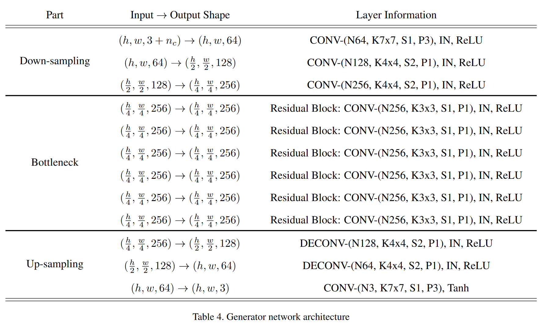 생성기는 마지막 출력 층을 제외한 전 층에 인스턴스 정규화(IN)를 적용하고, 판별기는 Leaky ReLU 활성함수를 사용하되 음의 기울기를 0.01로 설정한다. 또한 표기 변수들의 의미를 정의한다: nd는 도메인 수, nc는 도메인 레이블 차원으로서 CelebA와 RaFD를 함께 학습할 때만 nd+2가 되며 그 외에는 nd와 같다. 아울러 N(출력 채널 수), K(커널 크기), S(스트라이드), P(패딩), IN(인스턴스 정규화) 약어를 사용함을 명확히 한다.