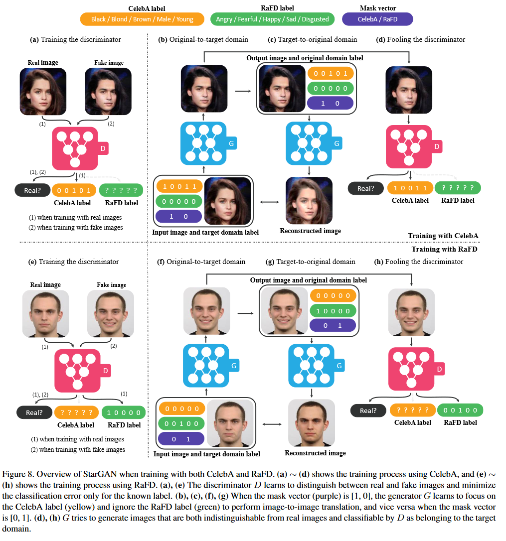 ※[부연설명] StarGAN은 서로 다른 라벨 체계를 가진 여러 데이터셋을 함께 학습하기 위해 마스크 벡터 $m$을 포함한 통합 라벨 $\tilde{c}=[c_1,\dots,c_n,m]$을 사용한다. 여기서 $c_i$는 $i$번째 데이터셋의 라벨 벡터(이진 또는 원-핫)이고, $m$은 길이 $n$의 원-핫 인디케이터로 현재 샘플이 어느 데이터셋에서 왔는지를 표시한다. 한 샘플을 구성할 때는 해당 데이터셋의 라벨 벡터만 실제 값으로 채우고, 나머지 $n-1$개 데이터셋의 라벨 벡터는 모두 0으로 두어 “미지정 라벨”을 비활성화한다. 중요한 점은 $m$이 모르는 라벨을 대체하는 값이 아니라, 모델이 학습·추론 시 어떤 라벨 블록을 신뢰해야 하는지 알려주는 역할을 한다는 것이다. 예를 들어 데이터셋이 두 개이고 라벨 집합이 각각 $\{a,b,c\}$와 $\{f,g,h\}$라면, 데이터셋1의 $a$ 샘플은 $c_1=[1,0,0],\ c_2=[0,0,0],\ m=[1,0]$로, 데이터셋2의 $g$ 샘플은 $c_1=[0,0,0],\ c_2=[0,1,0],\ m=[0,1]$로 표현된다. 결과적으로 $\tilde{c}$는 “각 데이터셋별 라벨 벡터를 나란히 이어 붙이고 마지막에 $m$을 덧붙인” 구조이며, 이 설계를 통해 StarGAN은 지정되지 않은 라벨을 자연스럽게 무시하고 지정된 데이터셋의 라벨만 활용해 다데이터셋 환경에서도 일관된 조건부 변환을 학습할 수 있다.