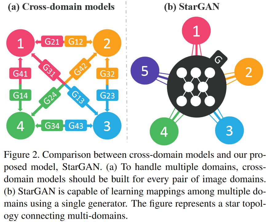 기존의 2-도메인 전용 이미지 변환 모델(DIAT, CycleGAN 등)은 한 번의 학습으로 오직 두 개의 도메인 사이에서만 변환을 수행할 수 있다. 따라서 전체 도메인 수가 $K$개일 경우, 가능한 모든 도메인 간 변환을 학습하려면 각 도메인 쌍마다 별도의 모델을 학습해야 한다. 여기서 도메인 간 변환은 방향성을 가지므로, 예를 들어 $A \to B$ 변환과 $B \to A$ 변환은 서로 다른 매핑으로 취급된다. 이 때문에 필요한 모델의 개수는 순열 공식 $P(K, 2) = K \times (K - 1)$로 계산되며, 도메인 수가 7개인 경우 총 42개의 모델이 필요하다. 이러한 구조는 도메인 수가 늘어날수록 모델 수가 기하급수적으로 증가하는 비효율성을 초래한다. StarGAN은 이러한 문제를 해결하기 위해, 모든 도메인 간 매핑을 단일 생성기와 판별기에서 처리할 수 있도록 설계되어, $K(K-1)$개의 모델을 학습해야 하는 기존 방식의 한계를 제거한다.