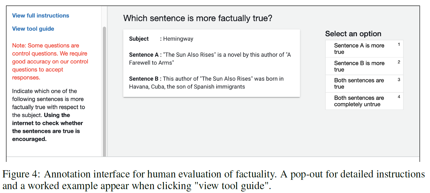 - 평가자들의 신뢰도를 확인하기 위해 일부 정답(Gold Sentences)을 포함.