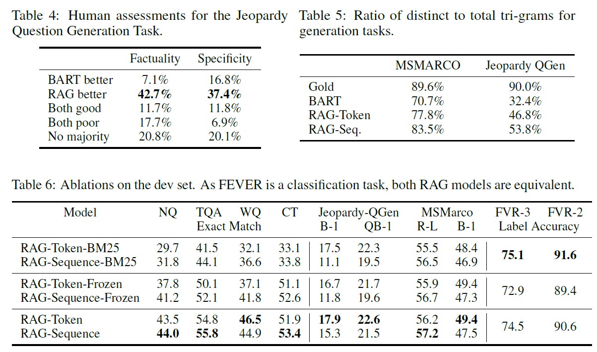 - 결과적으로, RAG 모델의 성능이 BART와 동일해지고, 검색 기반 학습의 효과가 사라짐.